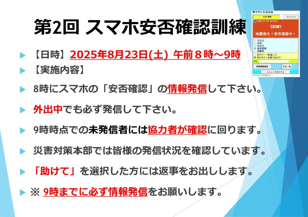第2回 スマホ安否確認訓練 第2回目となるスマホ安否確認訓練のお知らせです。スマホ情報発信訓練はどこにいても発信できます。 皆様の情報発信を災害対策本部で確認致します。9時までに未発信の方へは協力者が確認させて頂きます。 ⚫︎スマホ安否情報発信は自宅や外出先などスマホが使えるところではどこにいても発信できます。宜しくお願い致します。 一覧へ戻る