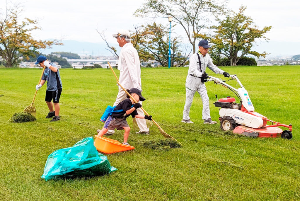 ちょっと早起きしてグリーンサポート隊と一緒に子供達も公園清掃。公園をきれいに保つには地域の人達の協力が必要です。