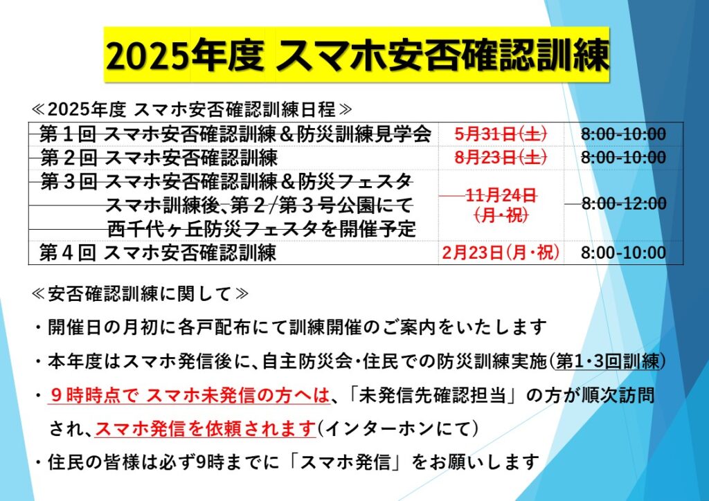 2025年度の防災訓練の日程をご案内します。実際の開催には開催月の月初にチラシでお知らせいたします。是非ともご参加ください。