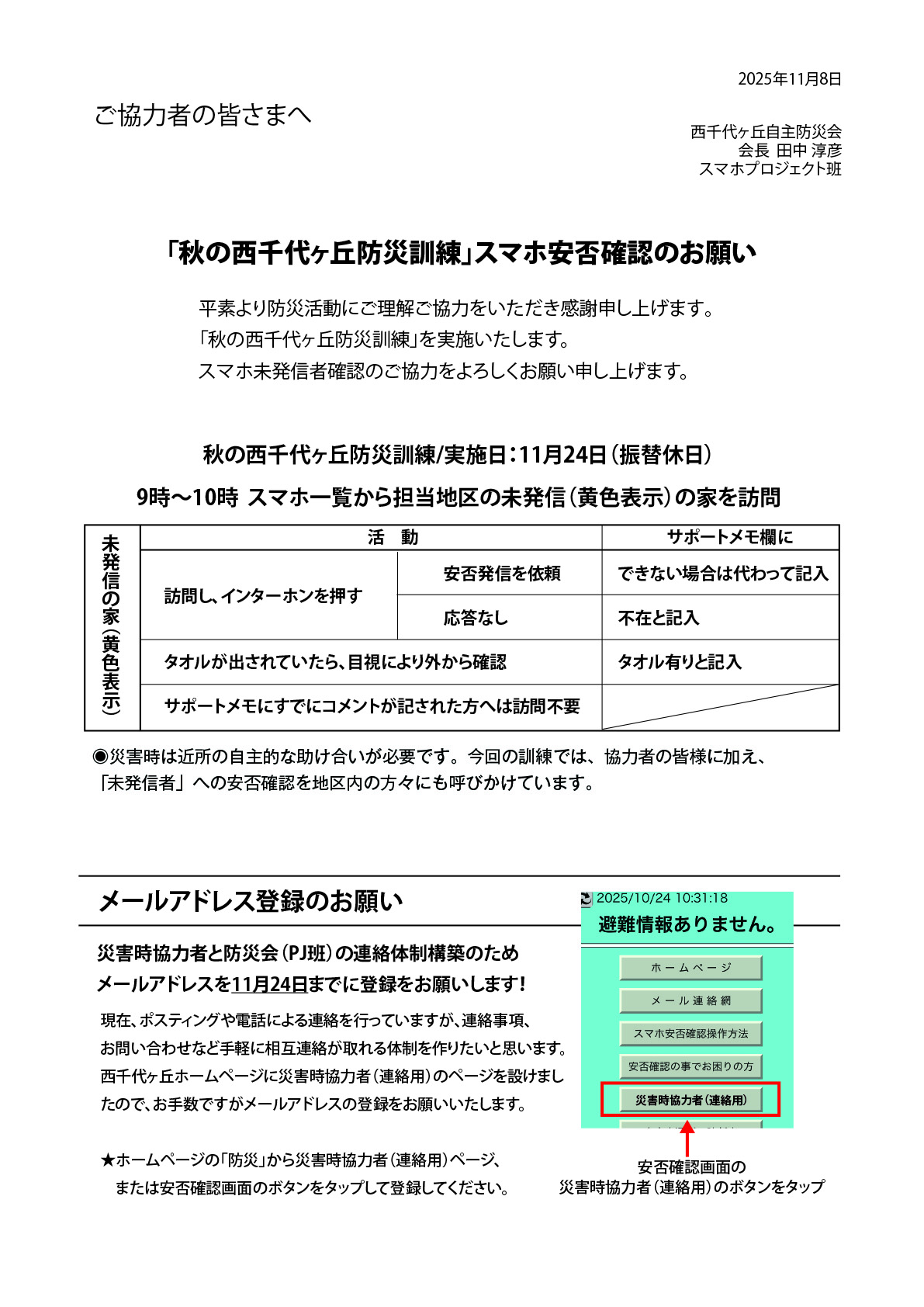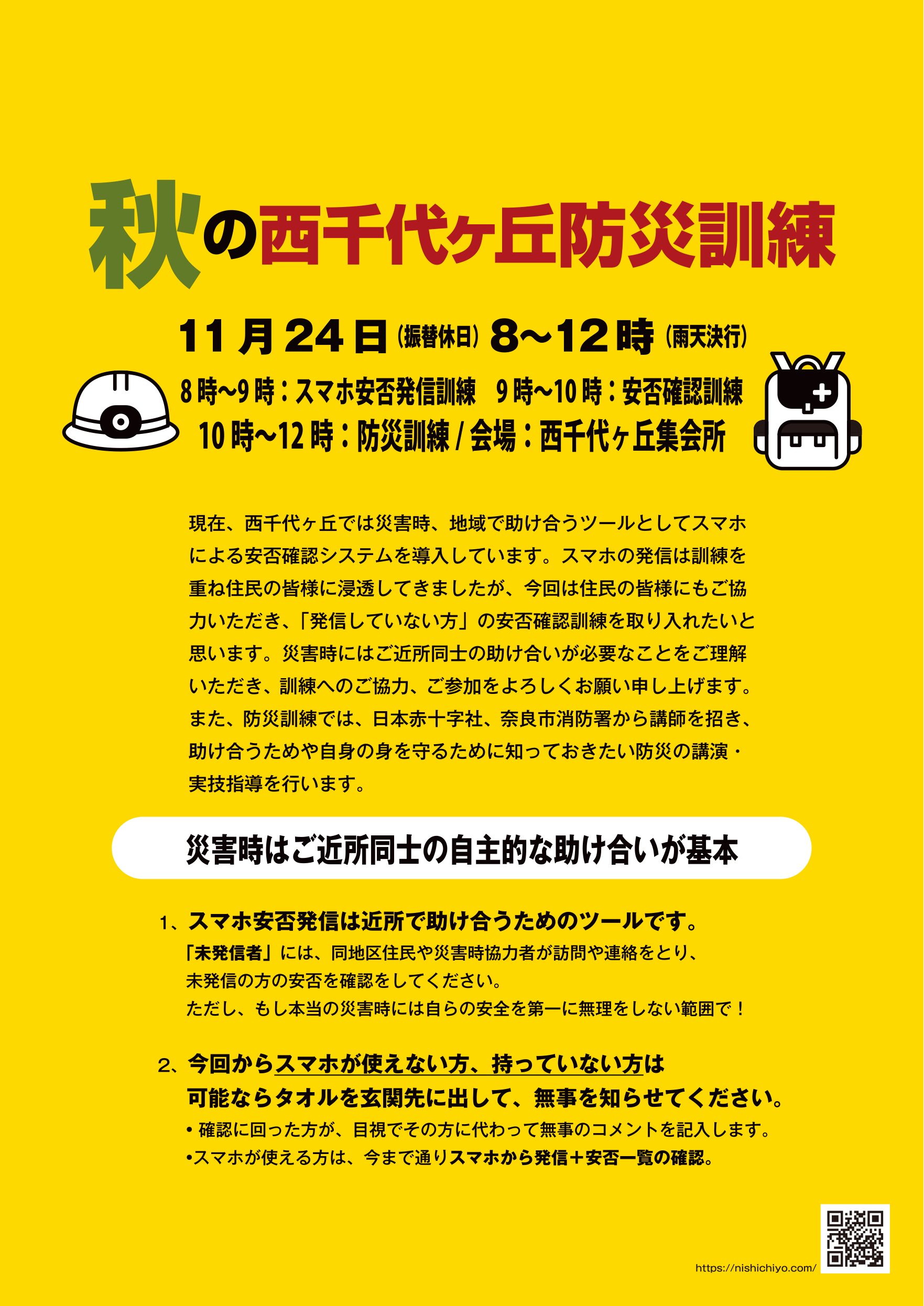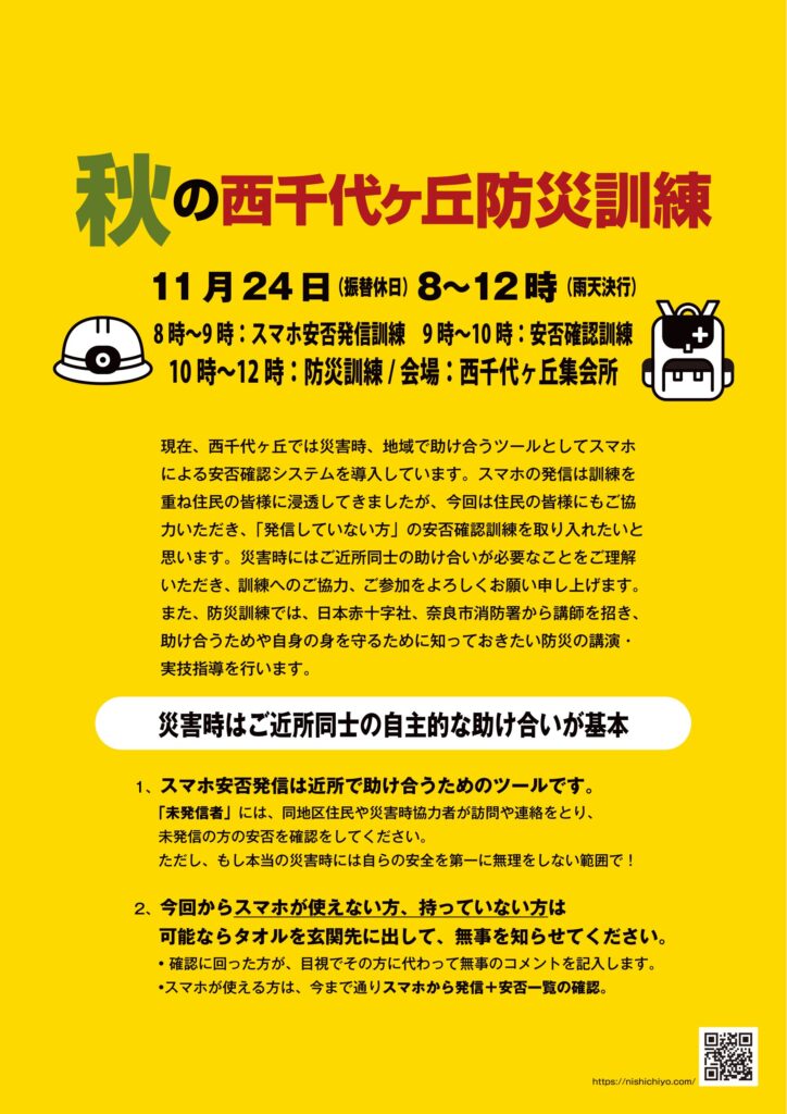 11月24日(振替休日)「秋の西千代ヶ丘防災訓練」を実施いたします。今回は安否確認訓練だけでなく防災訓練も行います。