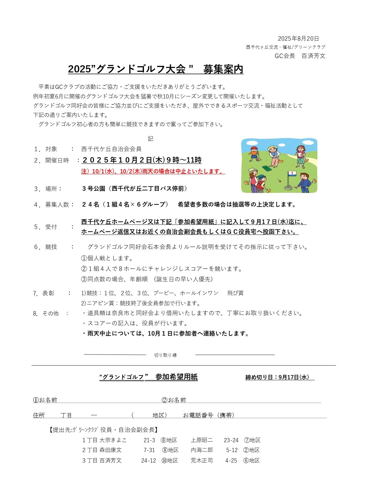 今年のグランドゴルフ大会は、例年の6月から10月にシーズン変更して開催します。本日より参加者を募集しますので、ベテランの方も初心者の方も奮ってご参加ください。