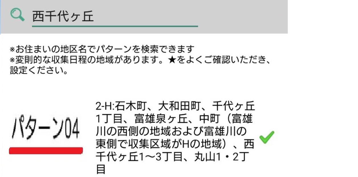 - 自分のお住まいの収集パタ―ンをタップし、右上の保存をタップします。(西千代ヶ丘はパターン04)